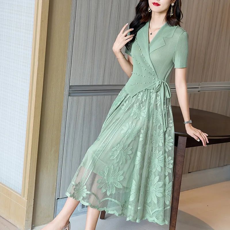 Vestido de malha bordado com cintura estreita e elegante Saia comprida de renda