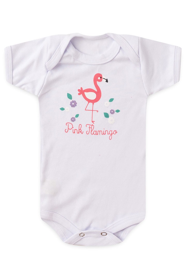 Body Bebê Feminino Manga Curta Canelado Branco Flamingo (RN/P/M/G) - Top Chot