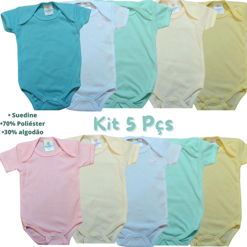 Kit 5 Pecas Body bebe Manga Curta Canelado Liso Suedine Algodão Poliéster