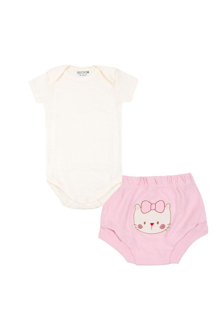 Conjunto Bebê Feminino Body Manga Curta Creme e Tapa Fralda Rosa Gatinha (P/M/G/GG) - Freedom Baby