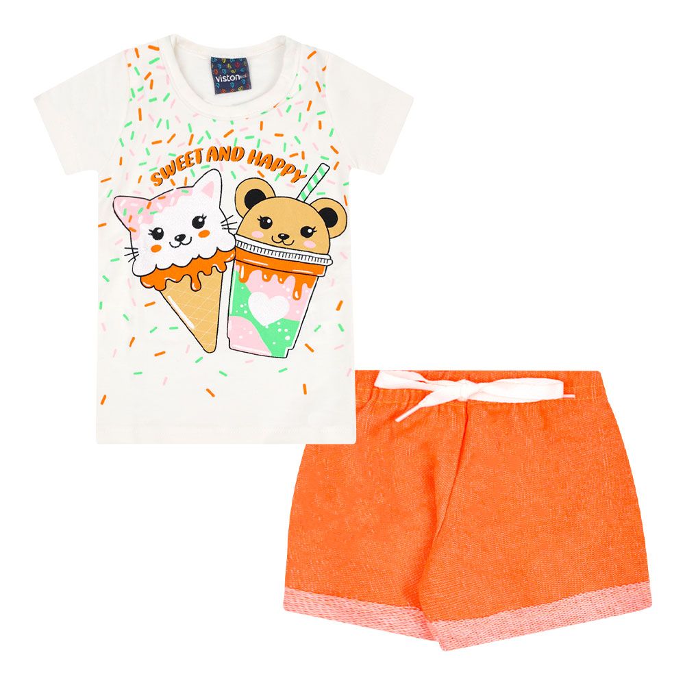 Conjunto Bebê Feminino Camiseta Off White e Shorts Moletinho Laranja Neon Gatinha (P/M/G) - Viston