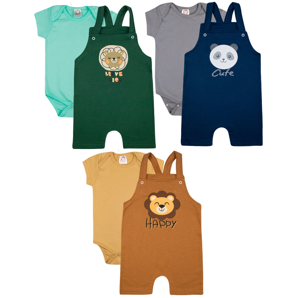 Kit Roupa De Bebe 6 Peças Jardineira Estampadas em Moletinho e Body Manga Curta para Menino ou Menina