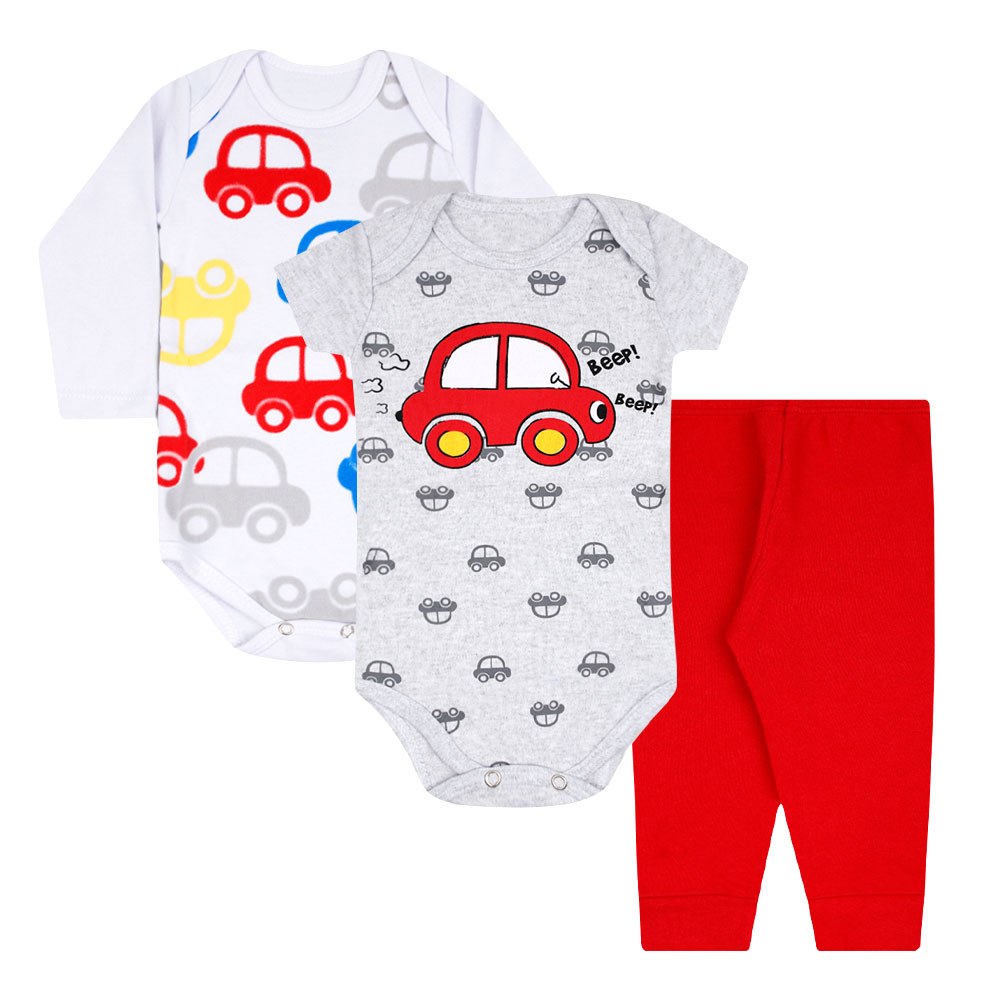 Kit Bebê 3 Peças Masculino Bodies Mescla e Mijão Vermelho Carrinhos (P/M/G/GG) - Orango Kids
