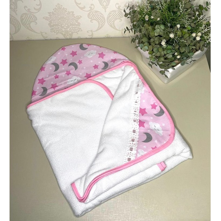 Toalha De Banho Bebe Dupla Face Com Capuz Forrada com fralda Céu Rosa