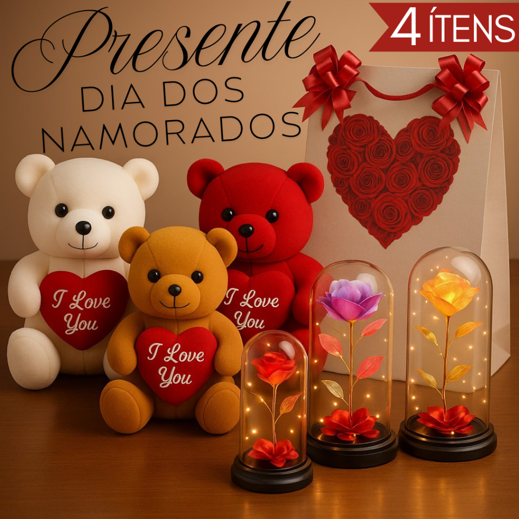 Kit Presente Dia dos Namorados Flor em Cúpula Led + Ursinho Pelucia "I Love you" Eu Te Amo Promoção