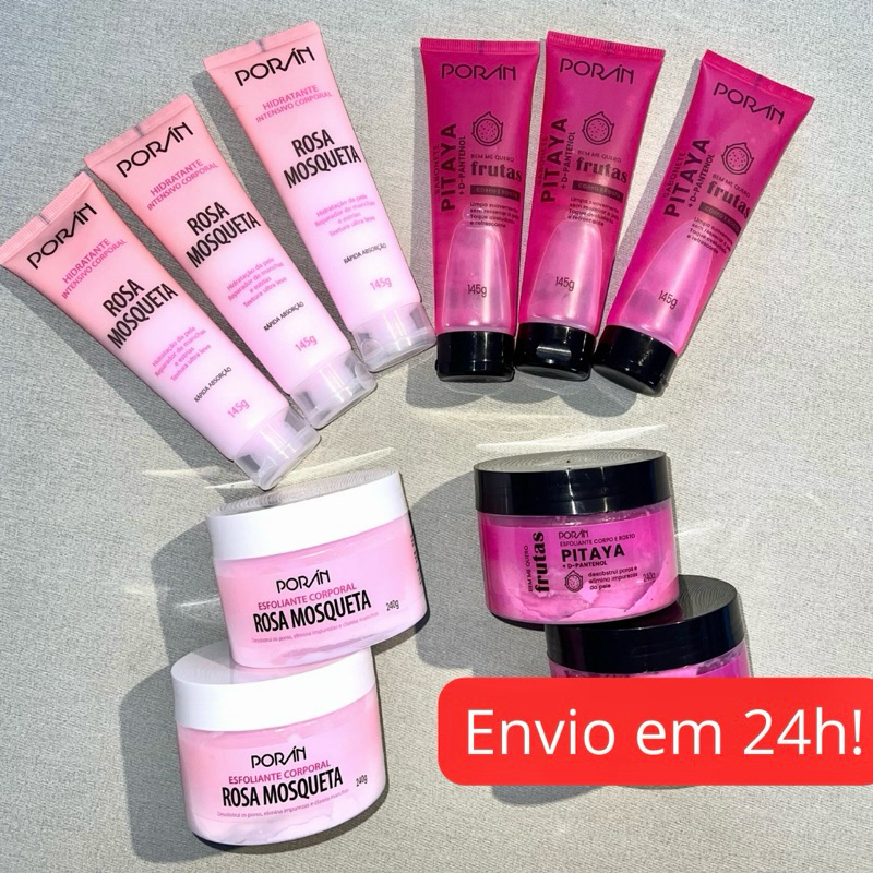 Kit Esfoliante Corporal + Sabonete Líquido Pitaya ou Kit Creme Hidratante + Esfoliante Corpo e Rosto Porán Rosa Mosqueta
