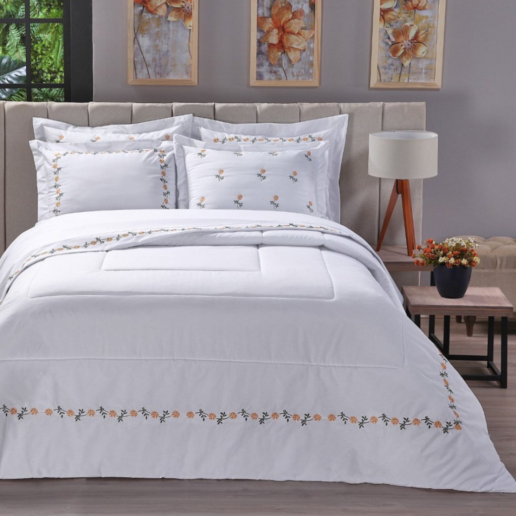 Kit Coordenado Completo Colcha Cobre Leito + Jogo de Lençol Casal, Queen ou King Percal 180 Fios Algodão Bordado Bouquet
