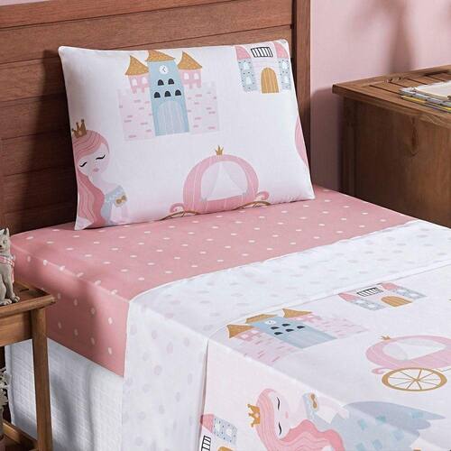 Jogo De Lençol Carrosel Solteiro 3 Peças Infantil Estampado Divertido - Princesa - 100% Poliéster - Blush