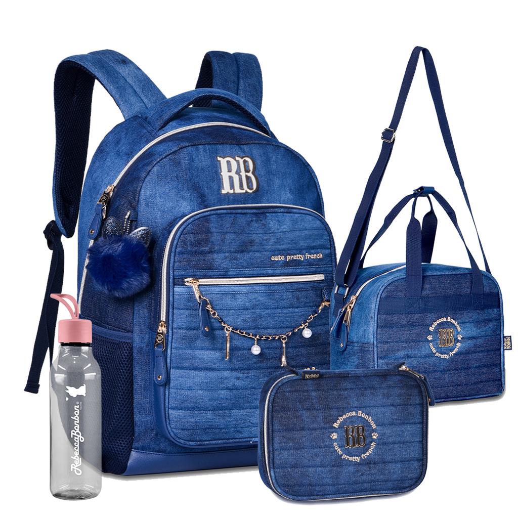 Kit Mochila Estojo Lancheira Termica Jeans Oficial Reforcada Garrafinha Original Adolescente Universitaria com Bolso Antifurto e Pompom RB Lancamento