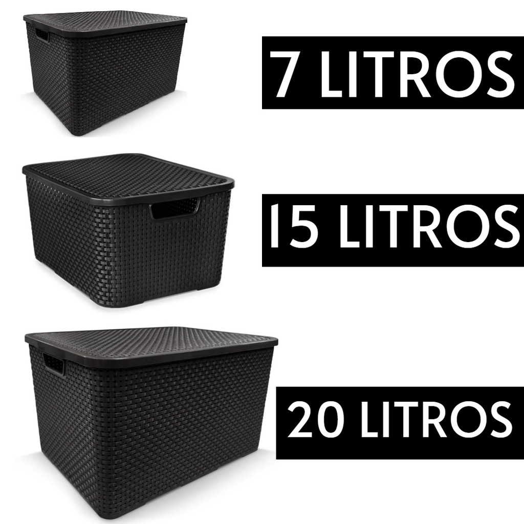 Kit C/ 3 Cesto - Caixa Organizadora Rattan - 20l, 15l E 7l - Preto