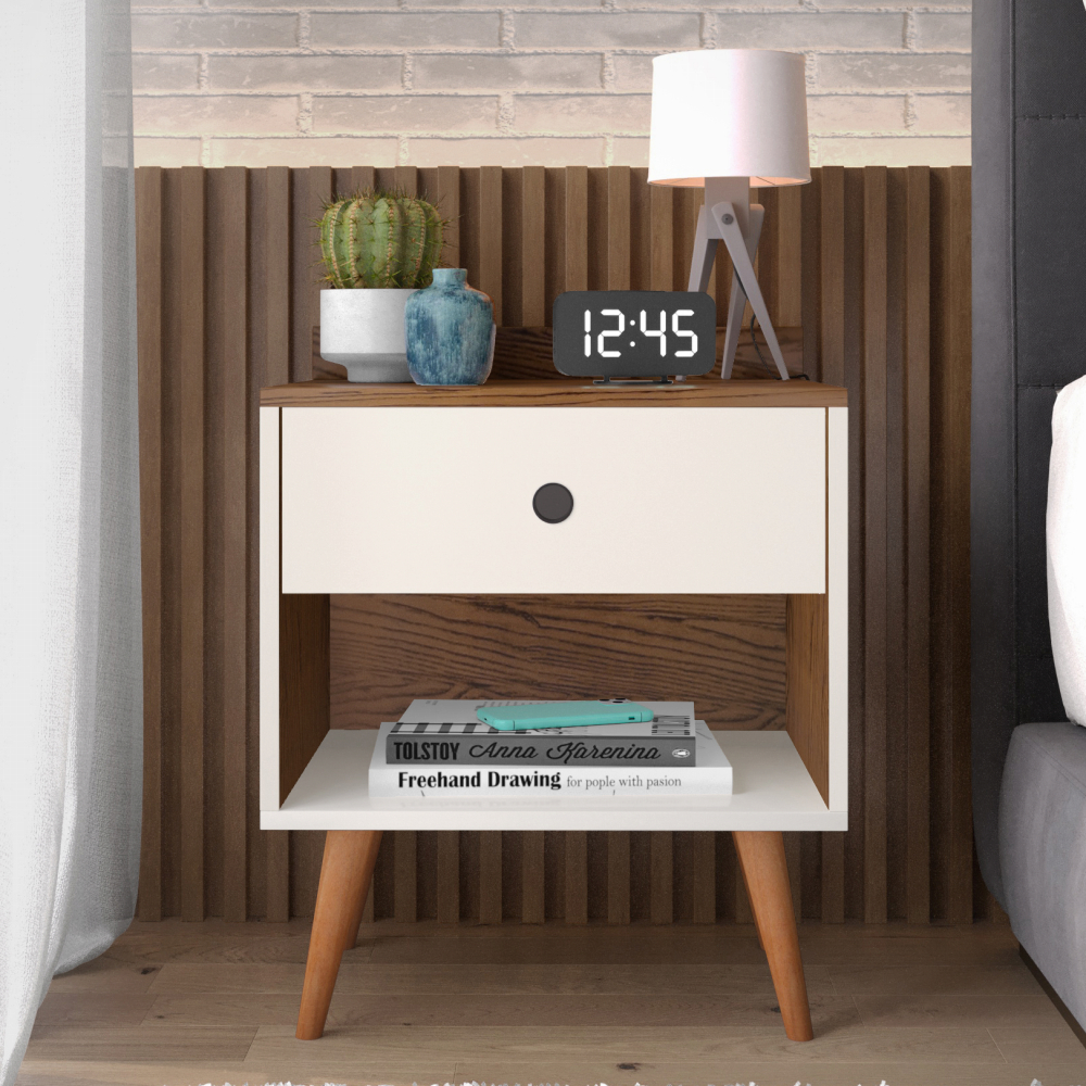 Mesa de Cabeceira Nicho Mesinha Quarto 1 Gaveta Puxador Concha Lauren Estilo Retrô - Off White/Freijó - Lojas RPM