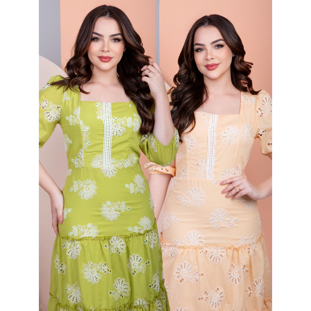 Vestido Midi Lese Soltinho para Festa Madrinha Decote Quadrado com Manga 3/4