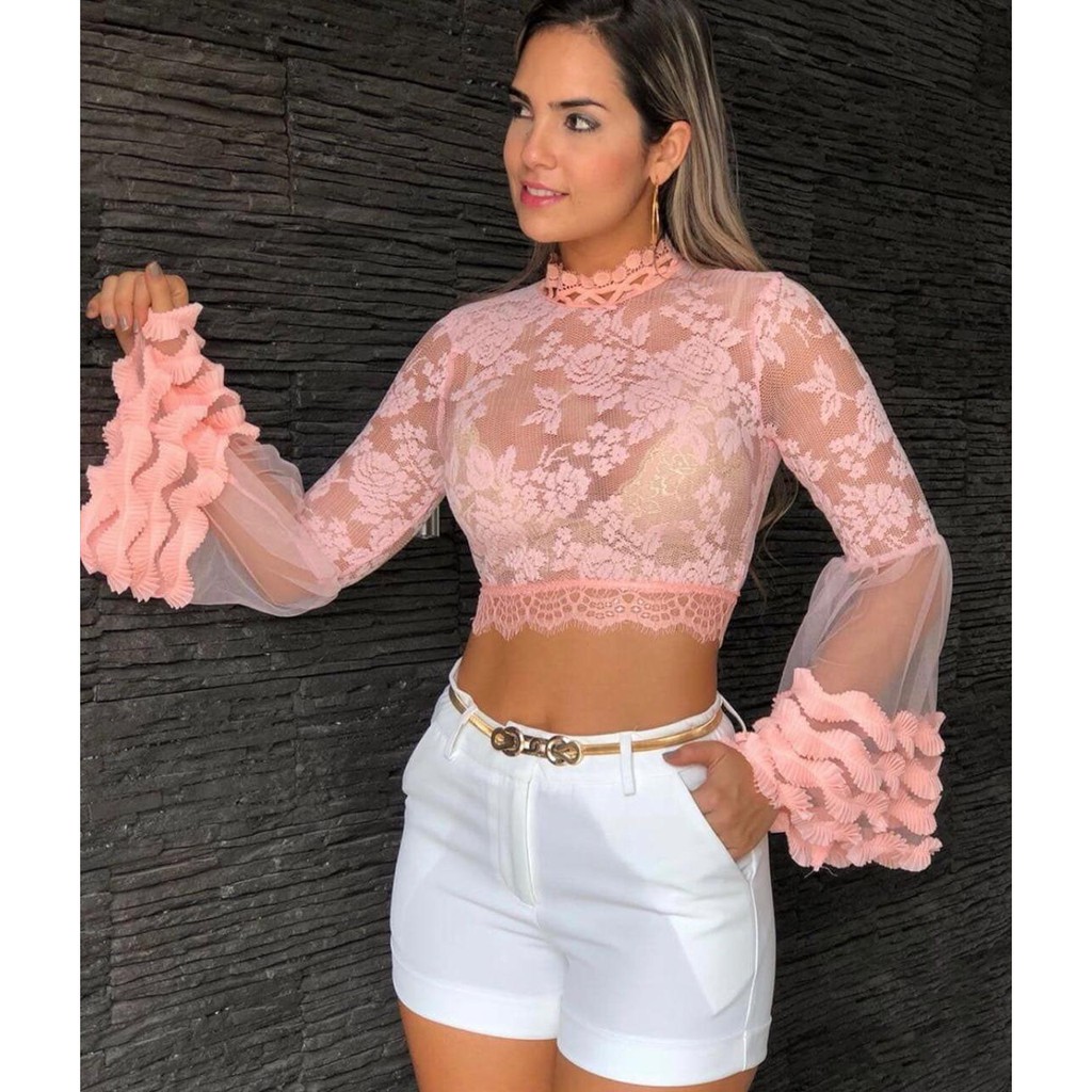 Blusa femenina de Tule e Renda com Babado em Guipir Manga Longa (AH1063)