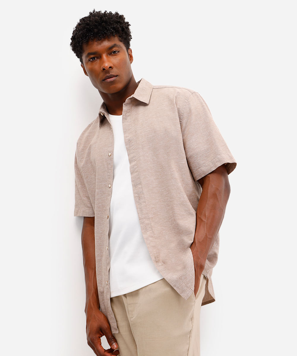 camisa comfort masculina com linho manga curta bege
