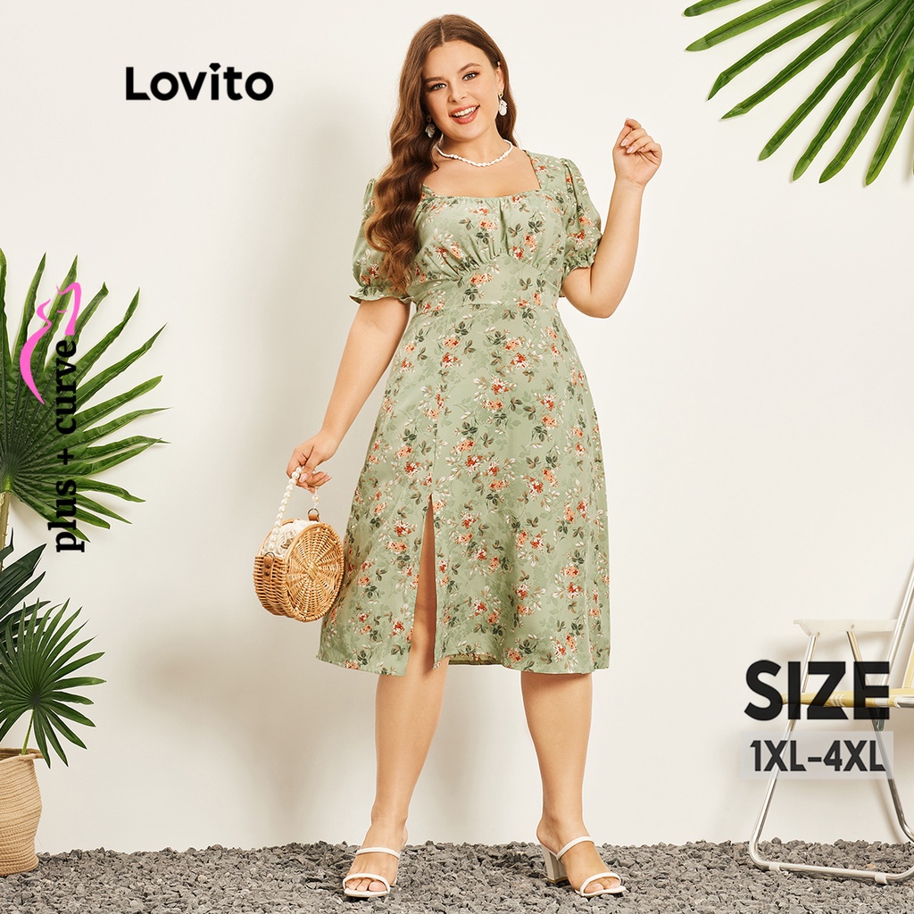 Lovito Plus Size Boho Floral Split Split Square Pescoço Manga Para Mulheres Vestido LPS06048 (Verde)