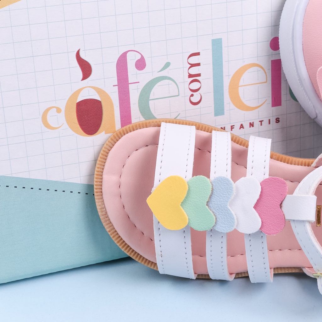 Sandália Infantil Menina Coração Coloridos Branca - Café com Leite