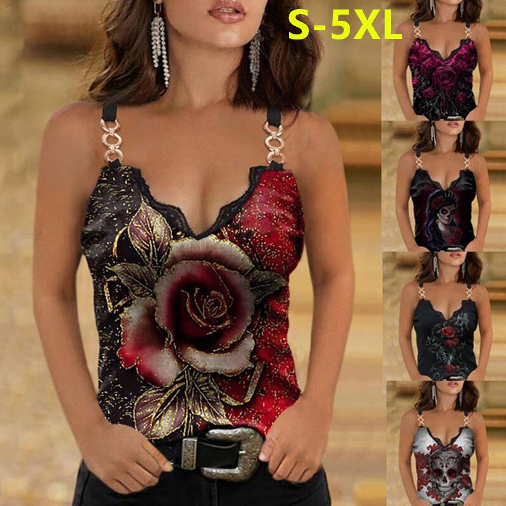 Camiseta feminina flor rosa estampado sem mangas fino de renda com decote em V Camiseta macia e confortável de verão fina