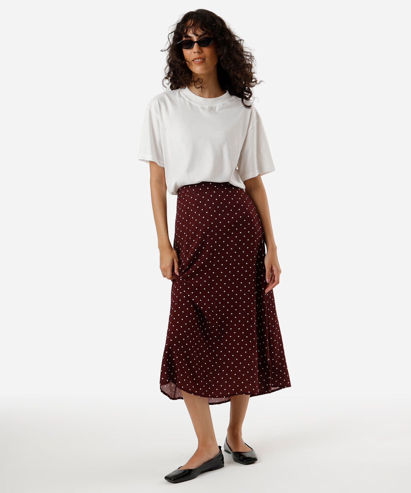saia midi evasê feminina de viscose poá vinho