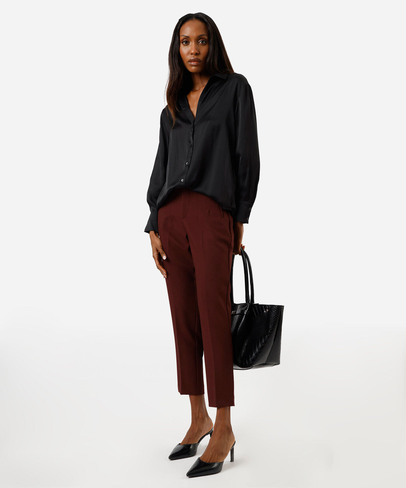 calça de alfaiataria feminina com pences vinho