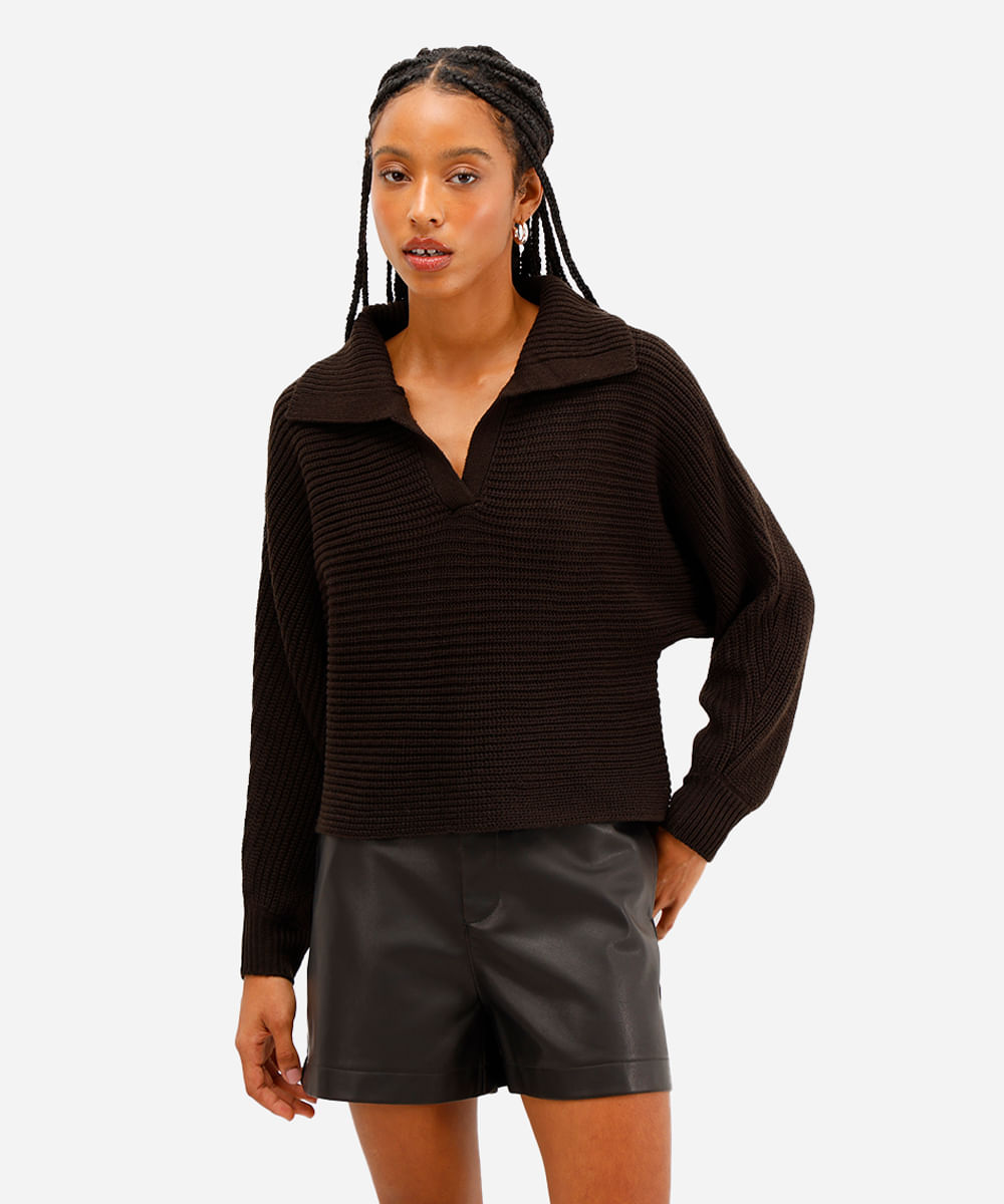 suéter feminino de tricot com gola polo marrom