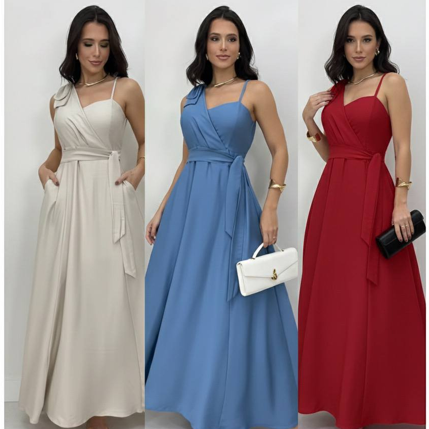 Vestido Longo em Tecido Duna linho com Laço no Ombro Único e Regulador do Outro Lado, com cinto e bolso – muito estilo