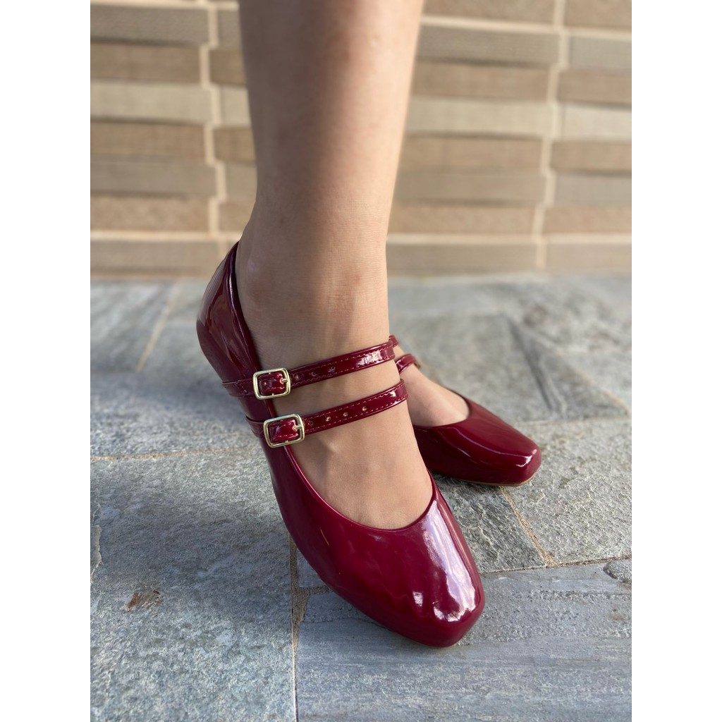 Sapatilha Mary Jane Feminina Verniz Marsala 2 Fivelas Bico Quadrado 0060