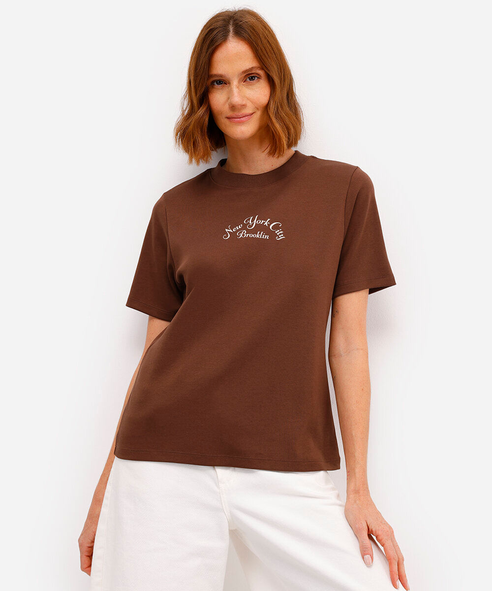 camiseta feminina de algodão peruano estampada marrom