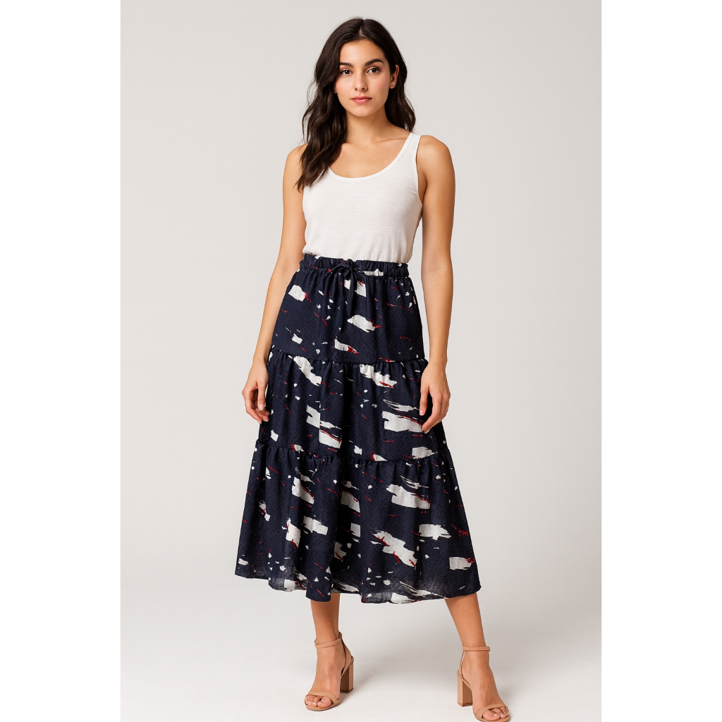 Saia Longa Feminina Crepe de Seda Azul Marinho Estampada