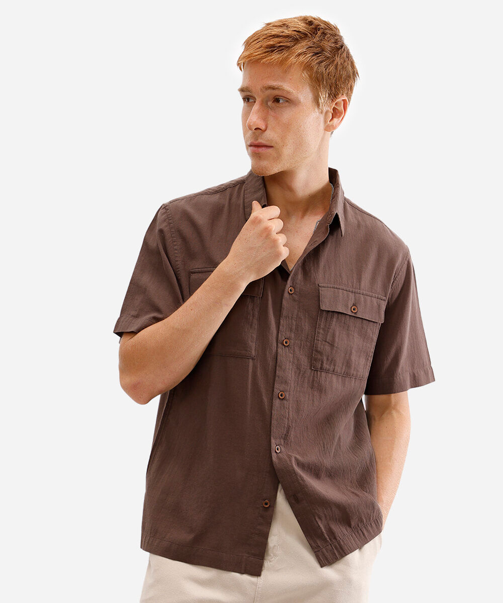 camisa masculina de algodão manga curta com bolsos marrom
