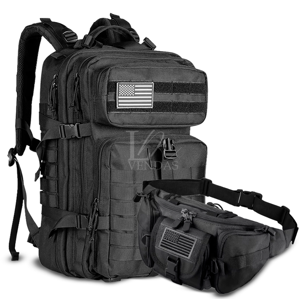 Kit Mochila Tática Impermeável 50 Litros Alça Reforçada + Bolsa Pochete De Cinto Acampamento Rave