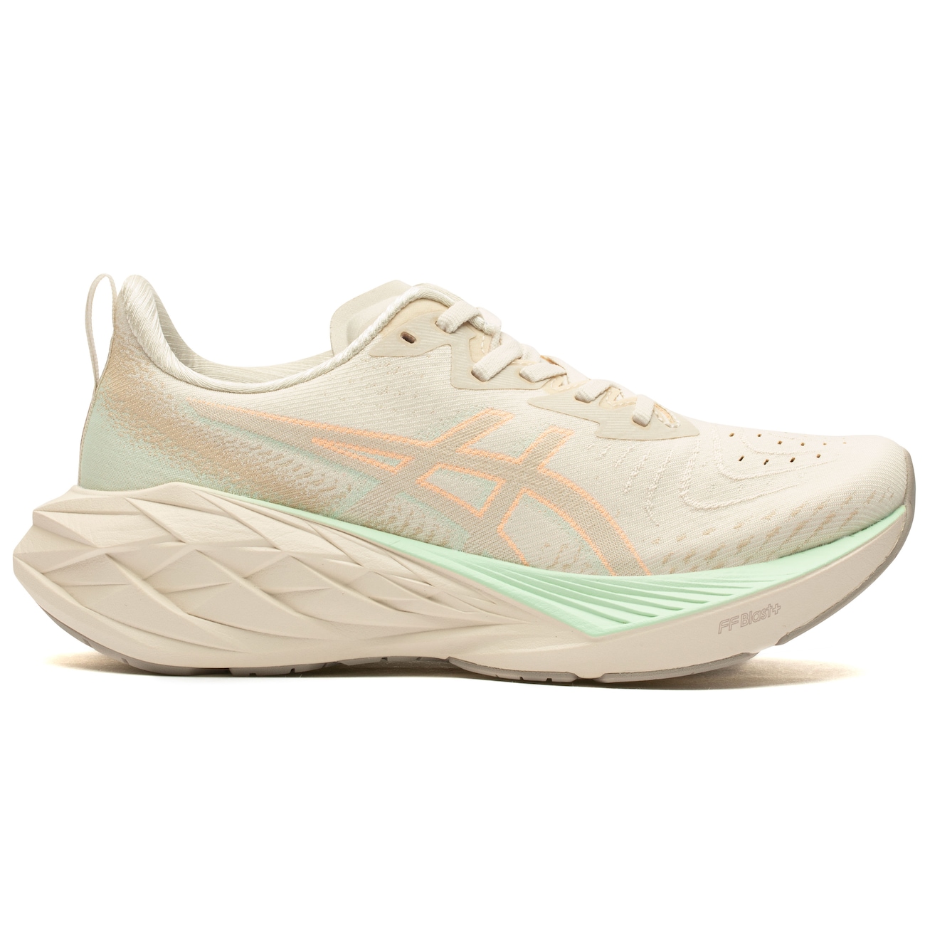 Tênis ASICS Novablast 4 - Feminino - Bege e Laranja com Verde