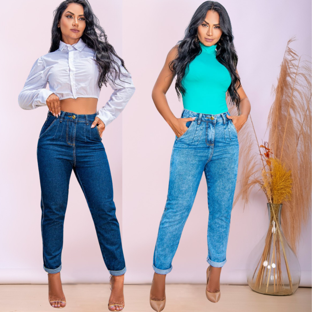 Calça Mom Jeans Feminina Cintura Alta Cós Alto Empina Bumbum Larga Curta Skinny Sem Lycra