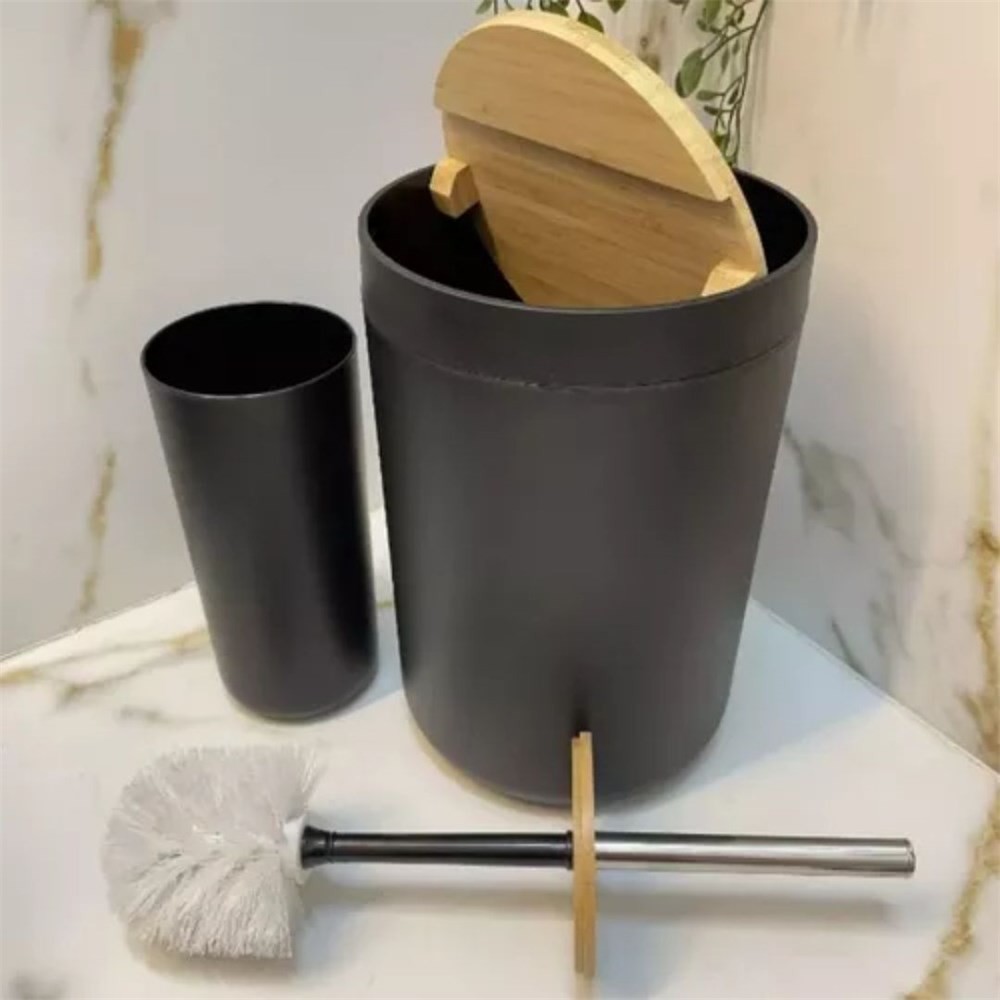 Kit pra Banheiro Bambu 2 Pçs Lixeira Escova Conjuto Lavabo de Vaso Preto ou Branco Cinza