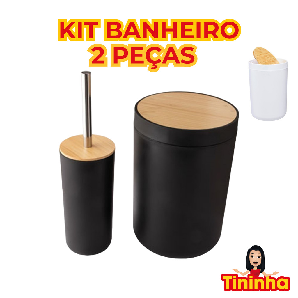 Kit pra Banheiro Bambu 2 Pçs Lixeira Escova Conjuto Lavabo de Vaso Preto ou Branco