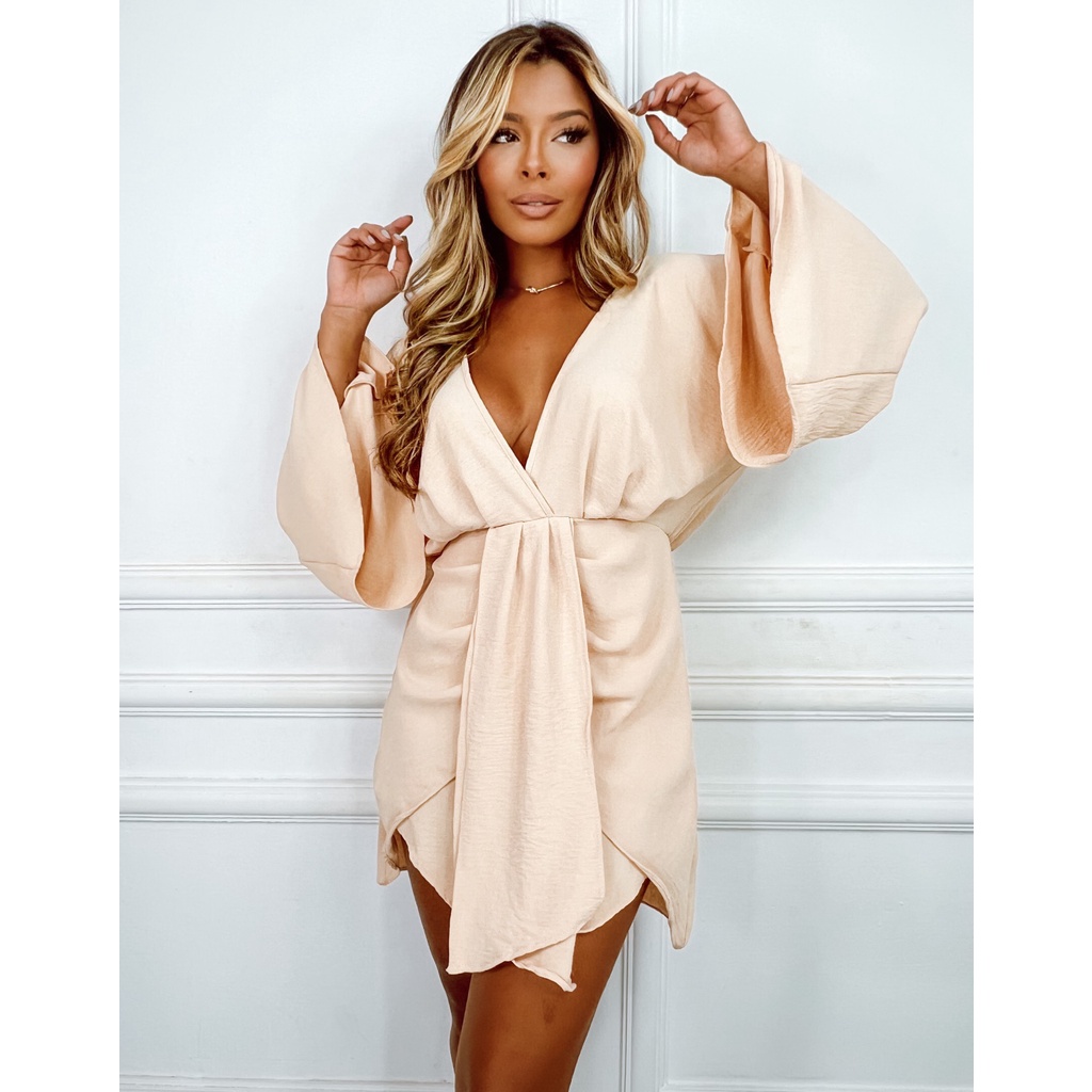 Vestido Curto Feminino Manga Longa Flare Decote V Soltinho Casual Elegante Verão Moda Gringa