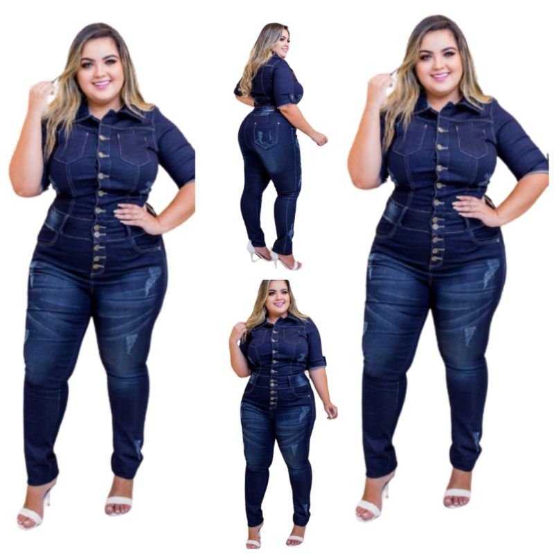 Macacão Jeans Feminino Manga 3/4 atraente Plus Size