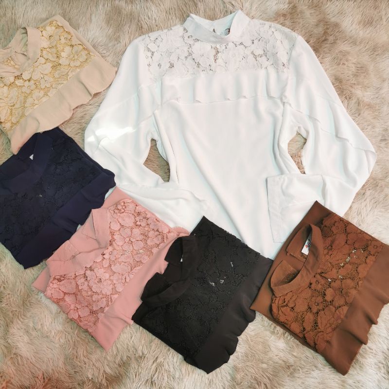 Blusa Feminina Manga Longa com babado/ renda desenhada /Gola-Redondo com botão atrás