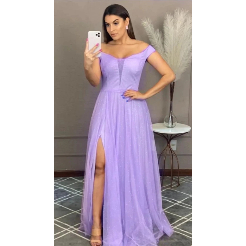 Vestido longo lilas lavanda ombro a ombro brilho casamento madrinha formatura festa p ao plus size Isabelly