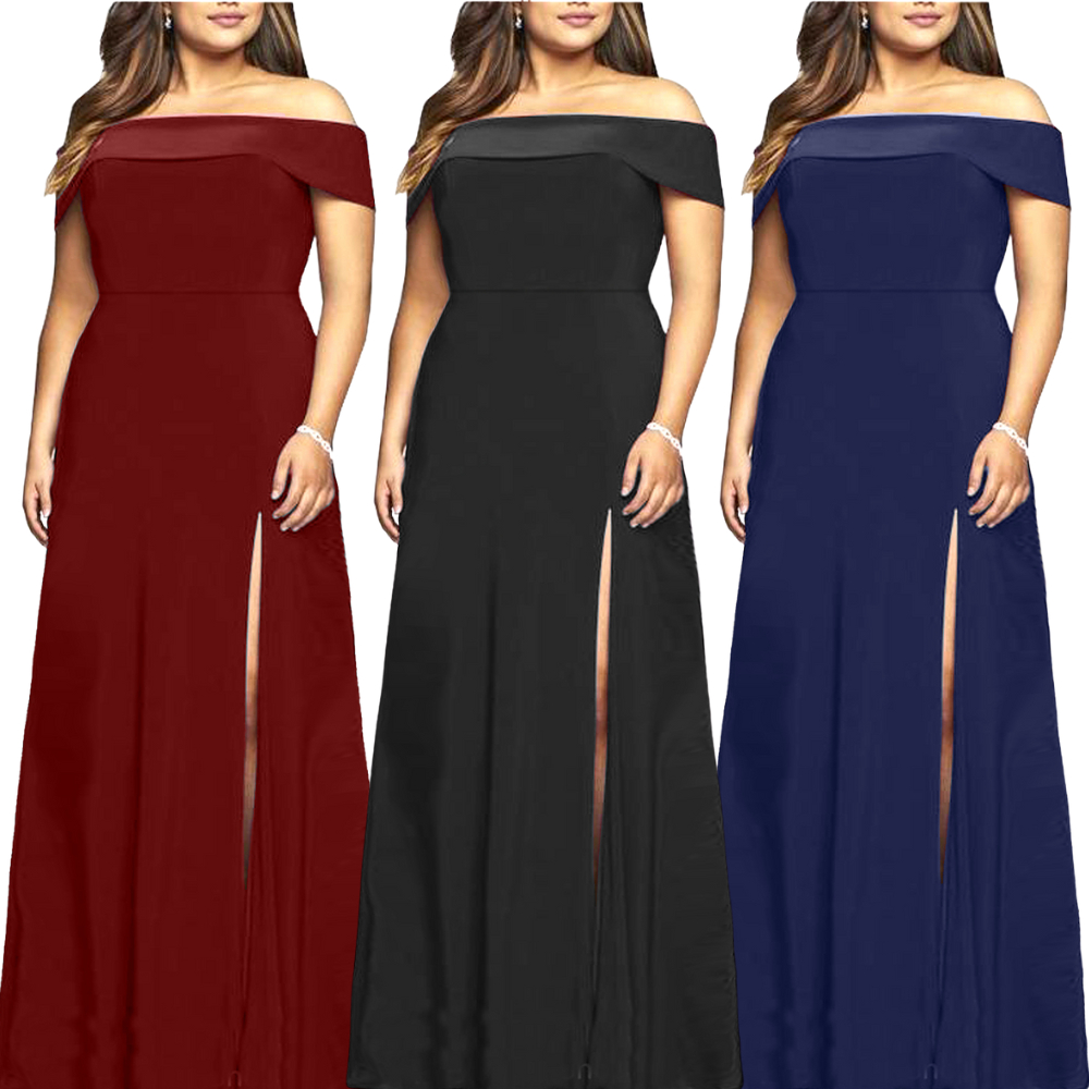 Vestido plus size de festa longo com fenda ombro a ombro