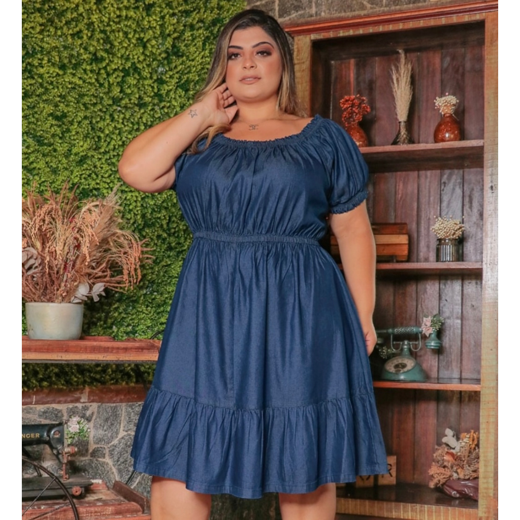 Vestido Jeans Feminino Plus Size Midi Soltinho Ciganinha Ombro a Ombro