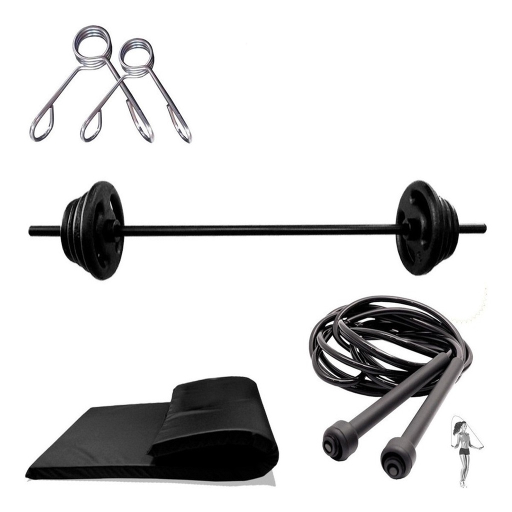 Kit Completo Pump C/barra 1,20m + 10kg de Anilha emborrachada + Colchonete + Corda Treino Musculação Agachamento em Casa