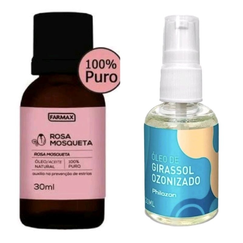 Kit 1 Óleo de girassol ozonizado 30ml PHILOZON 1 Óleo de Rosa Mosqueta 30ml Farmax cicatrizante, hidratante, manchas, estrias, celulite, uso pet
