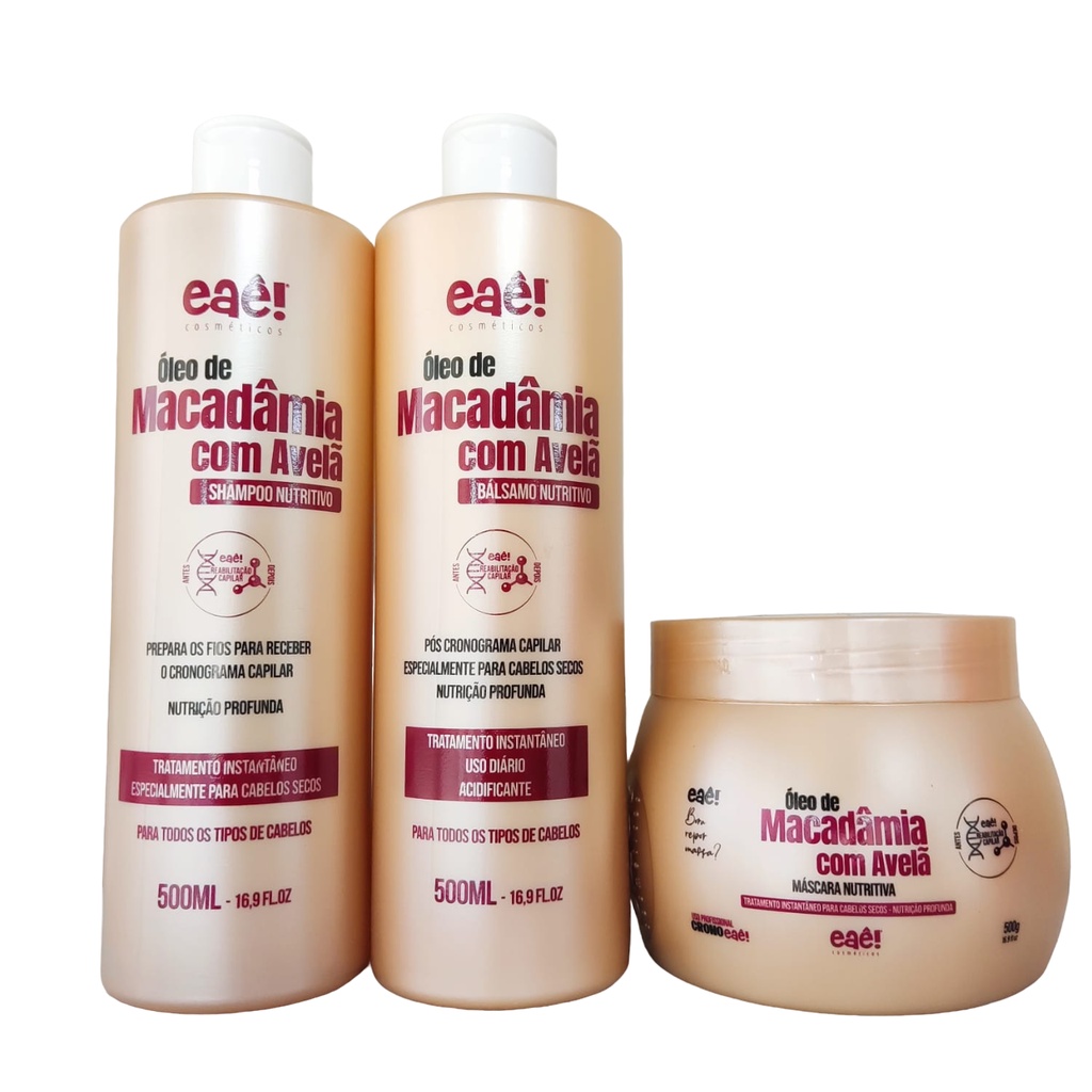 kit Óleo de Macadâmia c/ Avelã Manutenção Capilar Home Care Profissional Completo 3x500ml Eaê Cosméticos