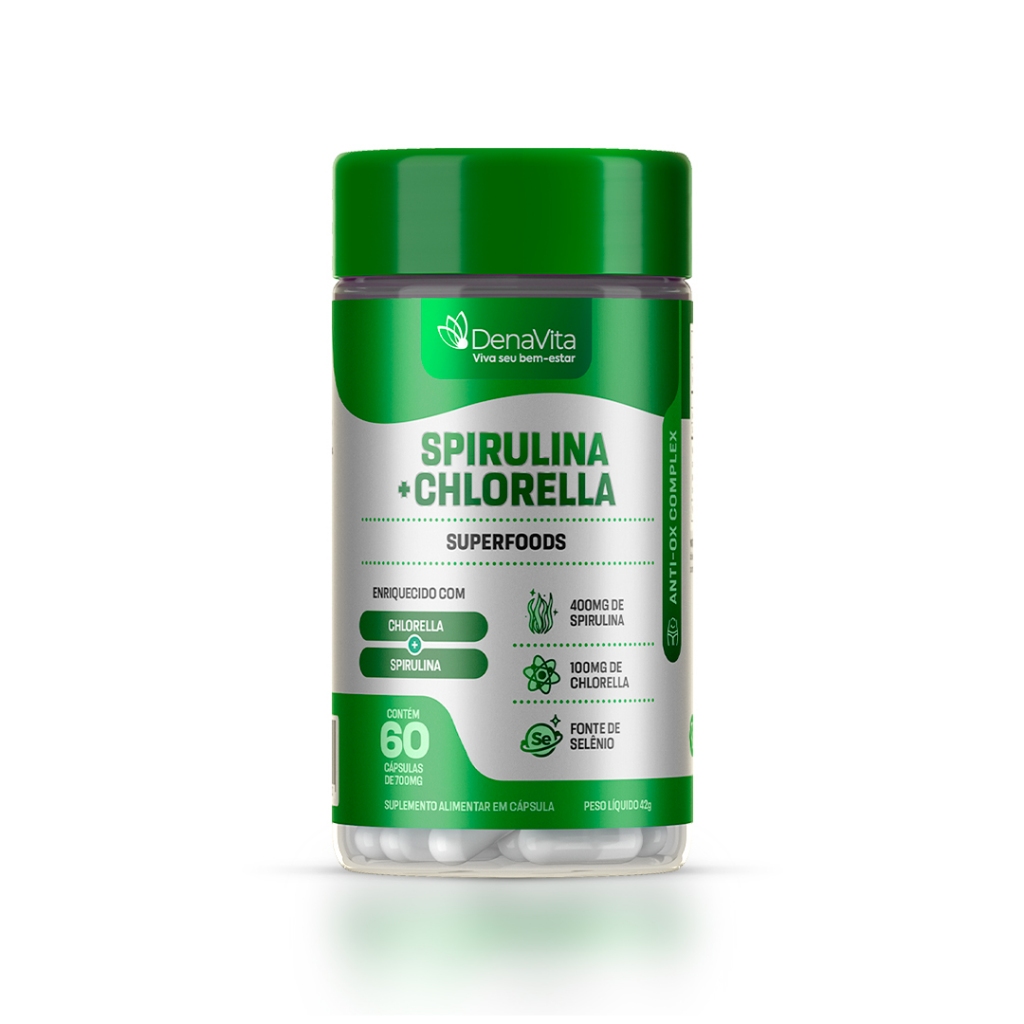 Spirulina com Chlorella 2x1, Superfoos, Rico em Proteínas, Vitamina B, Selênio, Suplemento Alimentar - 60 Cápsulas - DENAVITA