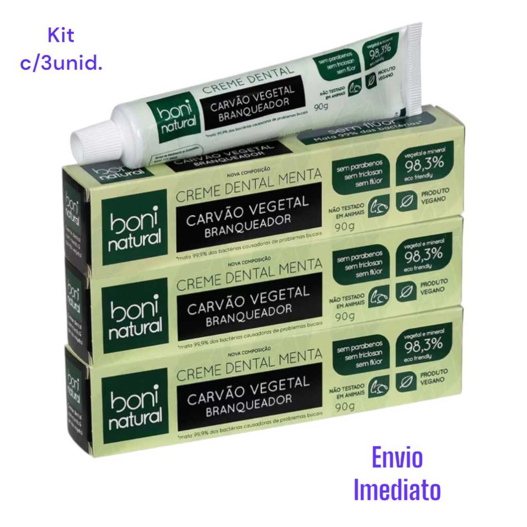 KIT 3 Creme Dental Boni Natural Menta e Carvao Vegetal 90g