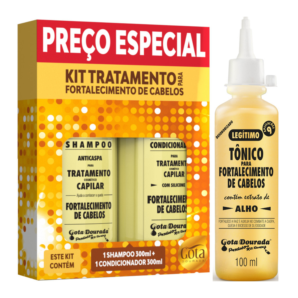 GOTA DOURADA KIT SH + COND FORTALECIMANTO 300ML + TONICO FORTALECIMENTO ALHO 100ML