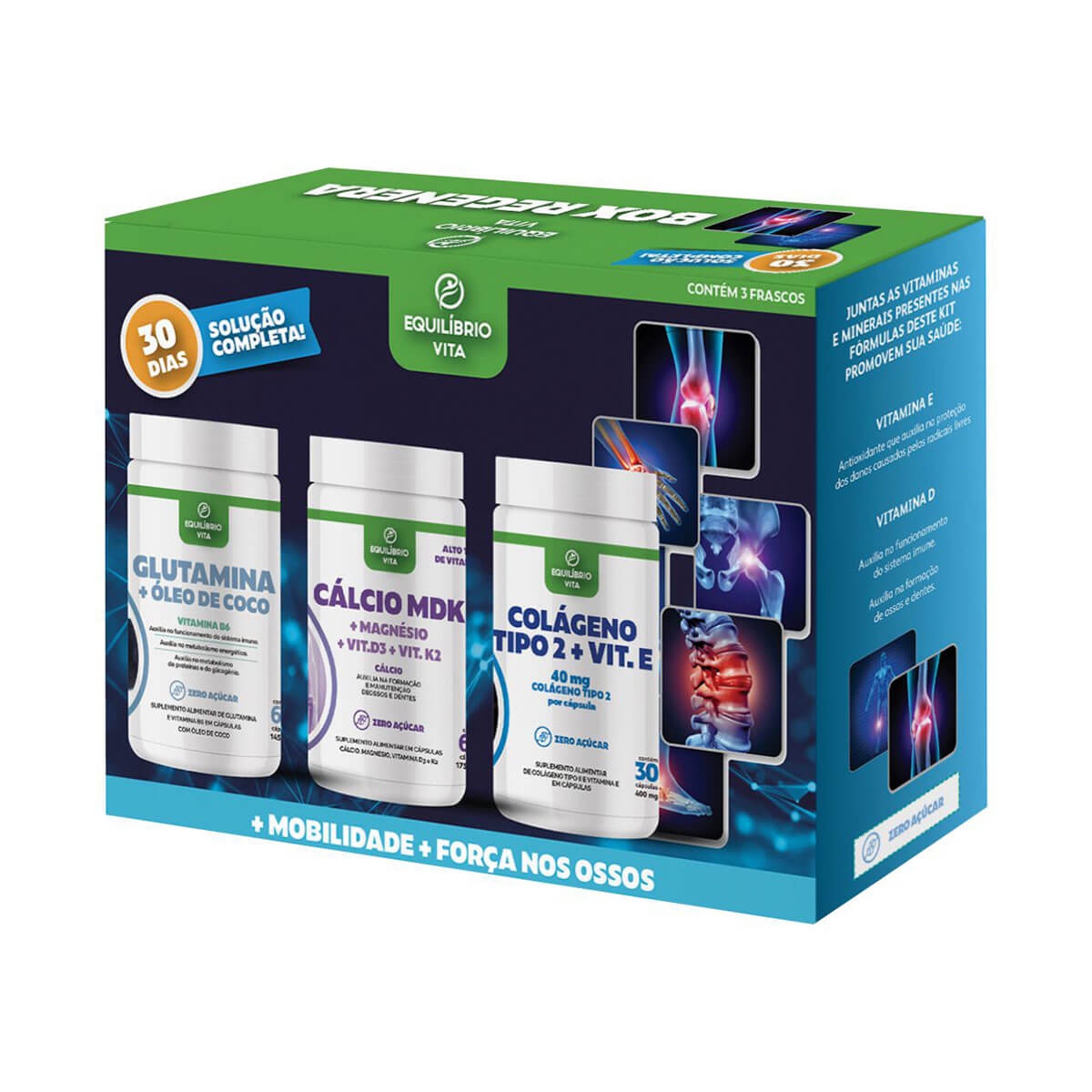 Box Regenera Equilíbrio Vita Kit com Glutamina + Cálcio MDK + Colágeno Tipo 2 com 150 Cápsulas