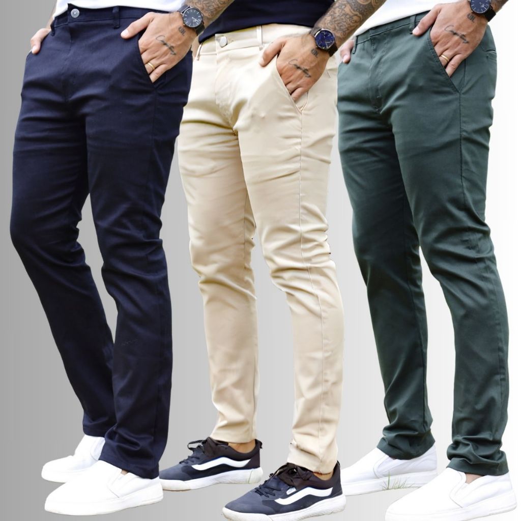 Calça Masculina Plus Size Sarja Com Lycra Colorida - Kit 3 Peças 50 ao 66 - Tamanho Grande - Preta - Branca - Vinho - Verde - Creme - Caramelo - Cinza