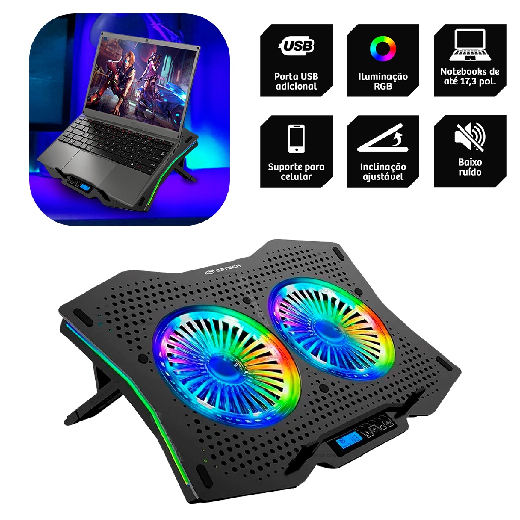 Suporte para Notebook Gamer Base Mesa Cooler C3Tech NBC-100BK 17 Polegadas Led Novo Pronta Entrega com Nota Fiscal