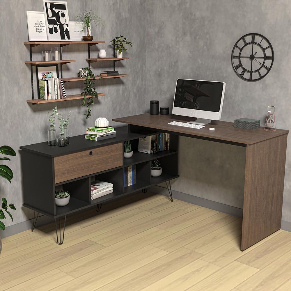 Mesa para Escritório Escrivaninha em L Home Office Kalil A02 Preto Ypê - Lyam Decor